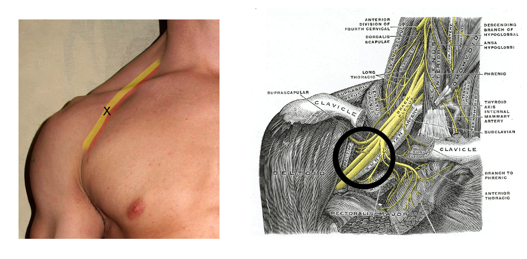 - Schemat prezentujący zmienność anatomiczną położenia struktur nerwowych splotu ramiennego w okolicy podobojczykowej (LIF Approach)