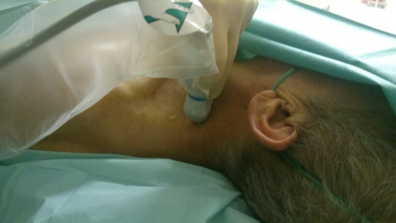 W celu uwidocznienia splotu w okolicy pomiędzy mięśniami pochyłymi, liniową głowicę USG przykładamy w obrębie trójkąta bocznego szyi, starając się uwidocznić tętnicę, żyłę szyjną wewnętrzną oraz zarys mięśnia mostkowo-obojczykowo-sutkowego. Po uwidocznieniu naczyń szyjnych przesuwamy głowicę w kierunku grzbietowym, poszukując mięśni międzypochyłych: przedniego i środkowego, pomiędzy którymi znajdują się hipoechogeniczne pnie splotu (najczęściej 3). W celu optymalizacji obrazu konieczne jest dobranie odpowiedniego kąta skanowania tak aby czoło głowicy znajdowało się prostopadle do struktur nerwowych .